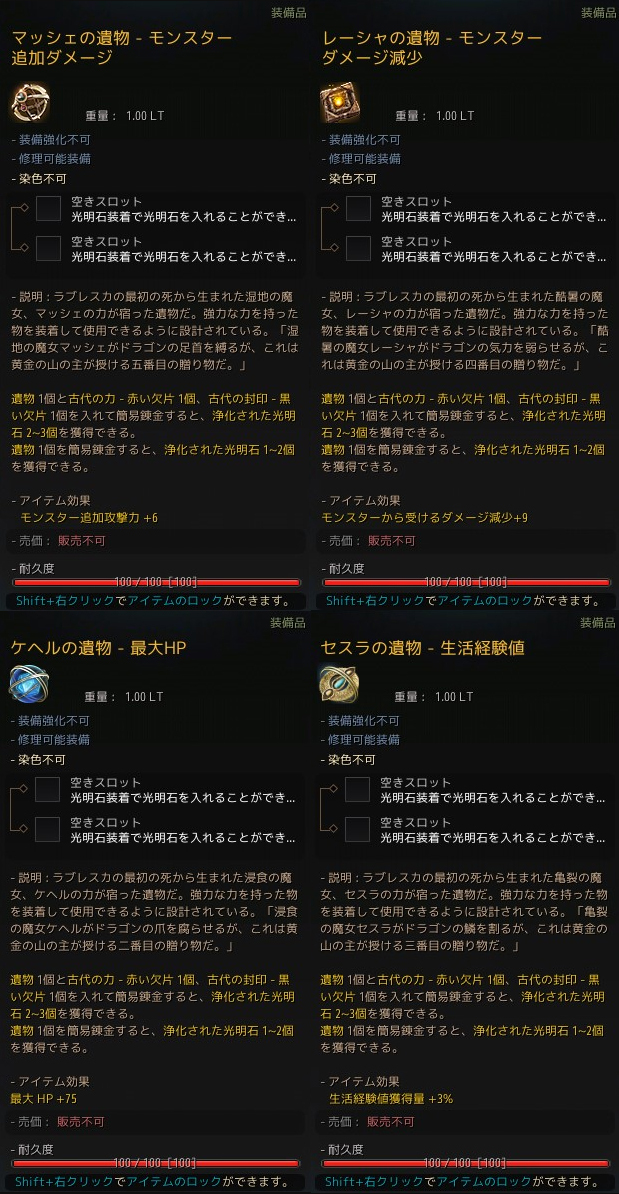 | ・グリフォン(ボス召喚書) ・ウルゴン(ボス召喚書) ・マスカン(ボス召喚書) ・リブル(ボス召喚書) ・カドリー廃墟 ・ケンタウロスの群れ ・パディクス島 | ・レーシャの遺物 – 全てのダメージ減少 (全てのダメージ減少 +3) ・レーシャの遺物 – 全ての回避力 (全ての回避力 +6) |