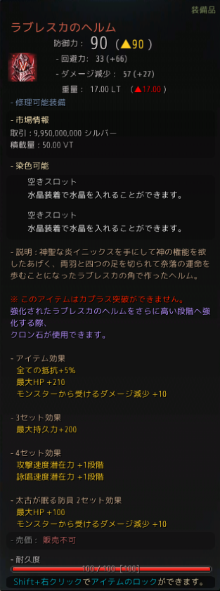 ラブレスカのヘルムは、カプラス突破ができなくて、セット効果は「ボス装備」または「死した神の鎧」が適用される。