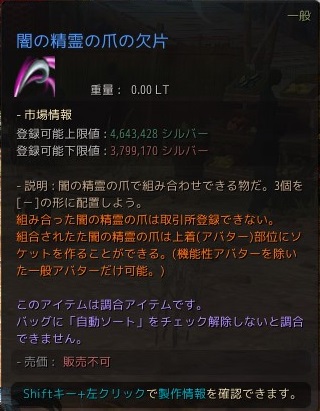 ちなみに「闇の精霊の爪の欠片」は、一部の狩りのドロップでも獲得できますが、取引所で購入したほうが早いと思います。