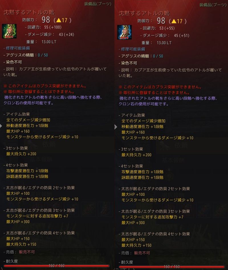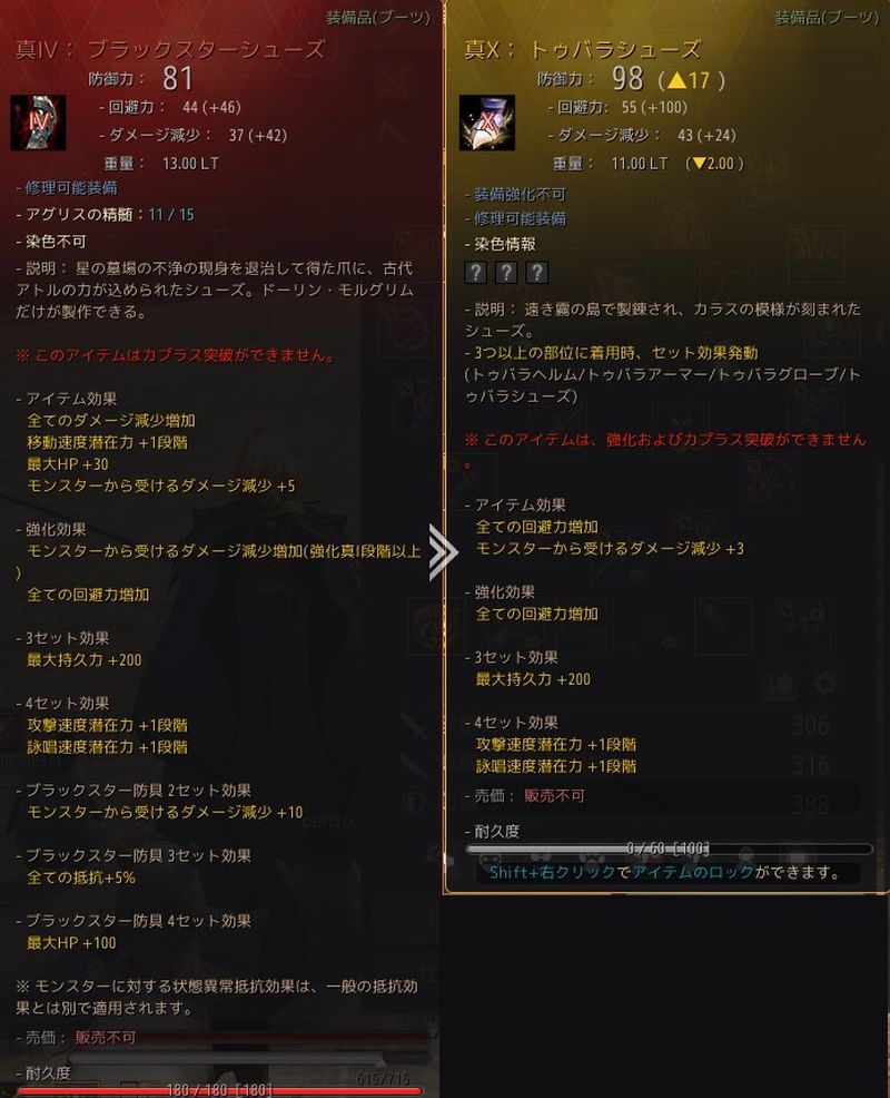 沈黙するアトルの靴に交換しなくても、真Ⅳブラックスターシューズよりも防御力が「17」も高いとか、もはや上級装備の域に達していますね。