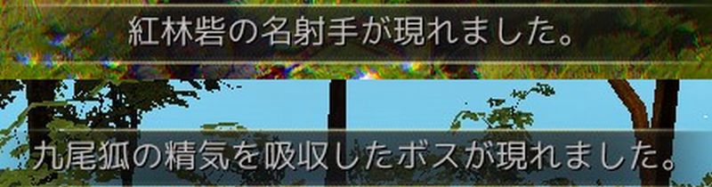 狩りを進めていると「紅林砦の名射手が現れました」や「九尾狐の精気を吸収したボスが現れました」とか出てきて、ギミックもたのしい。