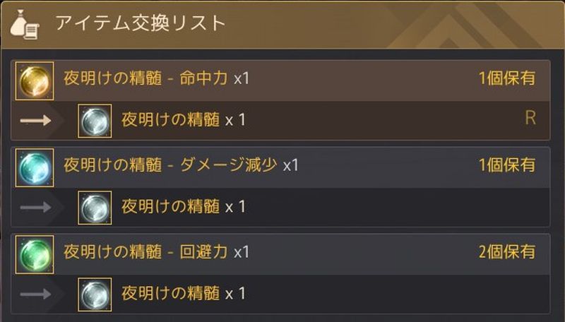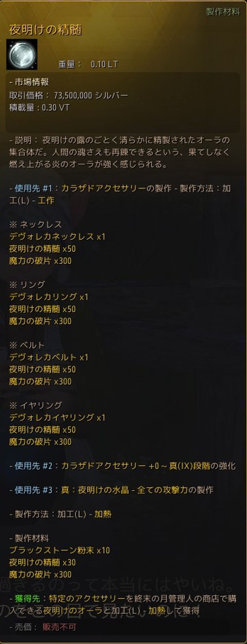 夜明けの精髄にしておけば、カラザドアクセサリーの製作や強化にも使えますし、「真:夜明けの水晶‐全ての攻撃力」の製作にも使えて、選択肢も多いのも魅力。