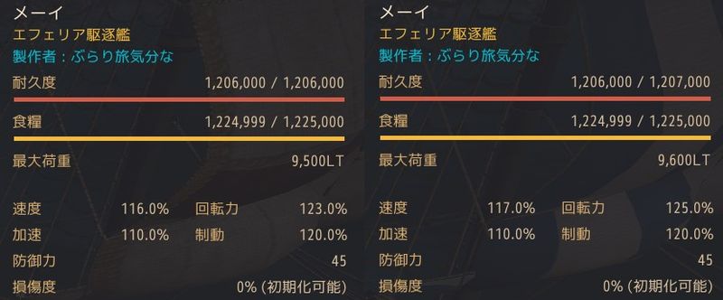 そして、ベネルア船舶外見装備を装備したら能力値はどう変わるのか?も確認しておきたいですよね!
