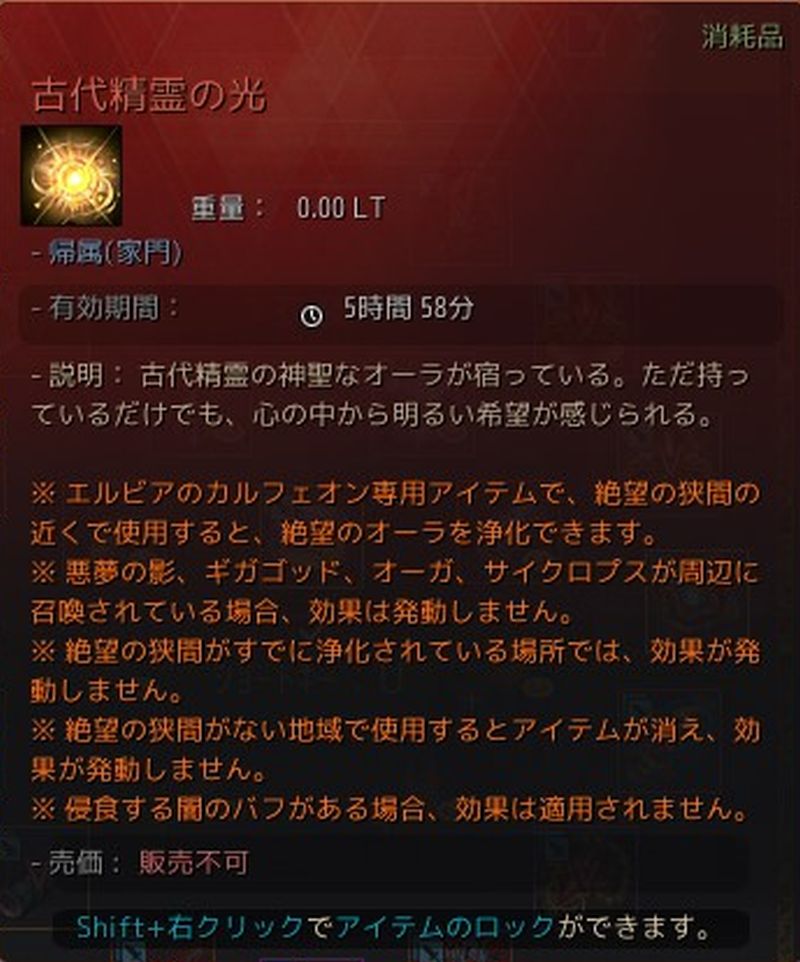 古代精霊の光は、「エルビアカルフェオン専用アイテムで、絶望の狭間の近くで使用すると、絶望のオーラを浄化できます。」となってます。
