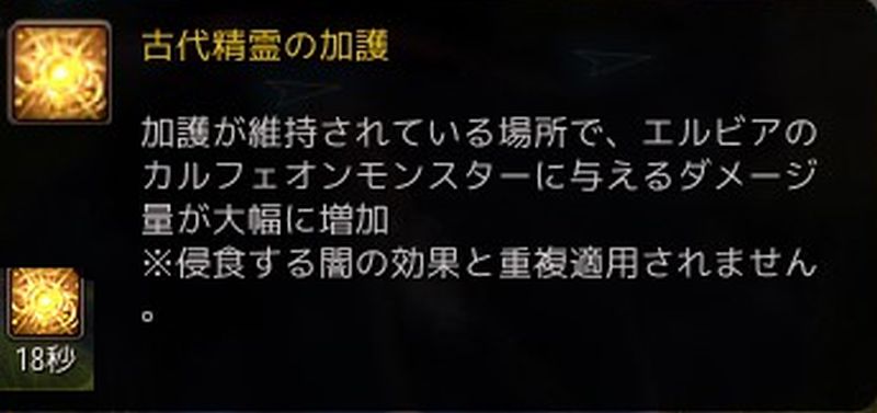 古代精霊の光の効果が適用されている時は、バフ一覧に「古代精霊の加護」として表示されています。