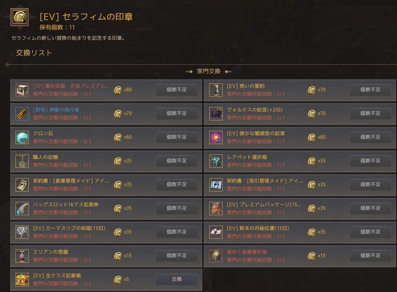 | [EV] 全クラス記章箱 | 家門あたり1回 | 5個 |