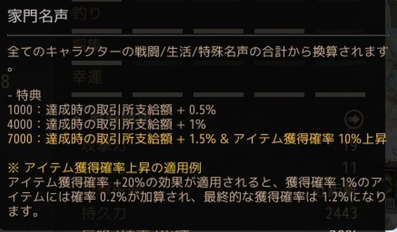 特殊名声を上げることで「取引所支給額」が増えたり、最大値まで上げると「アイテム獲得確率+10%上昇」という特典が付きます。
