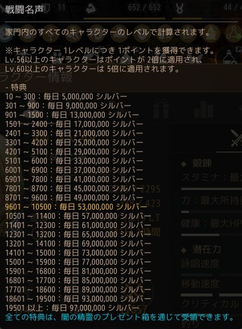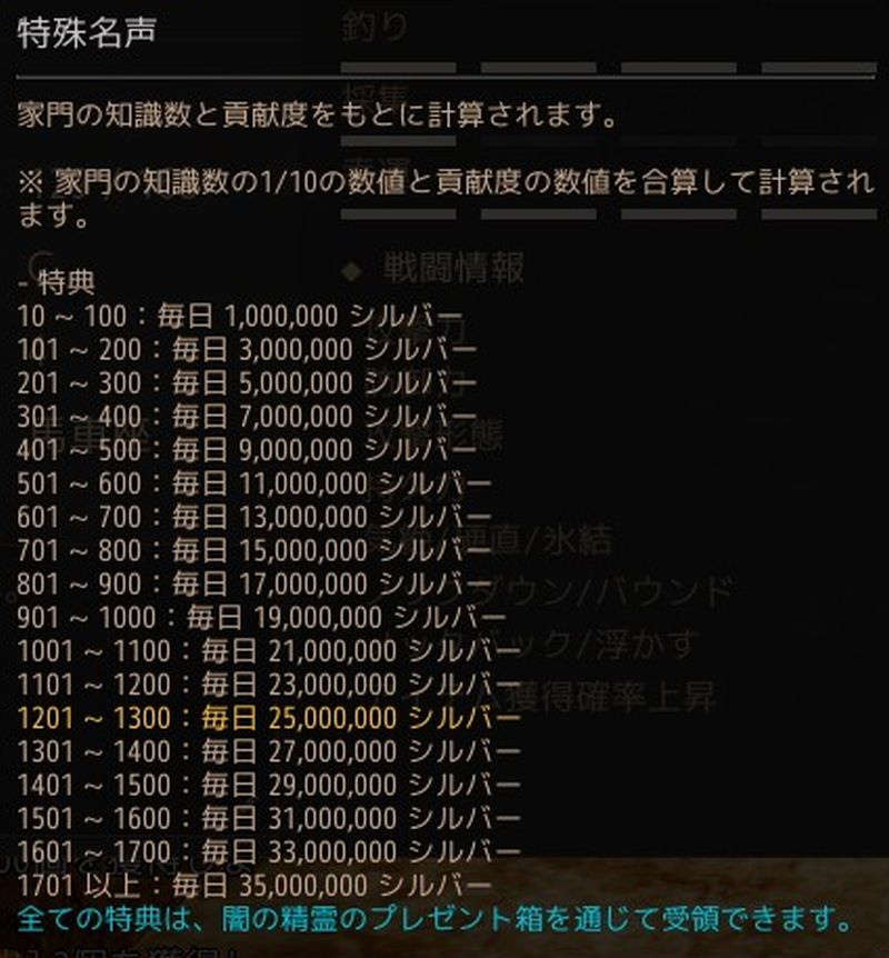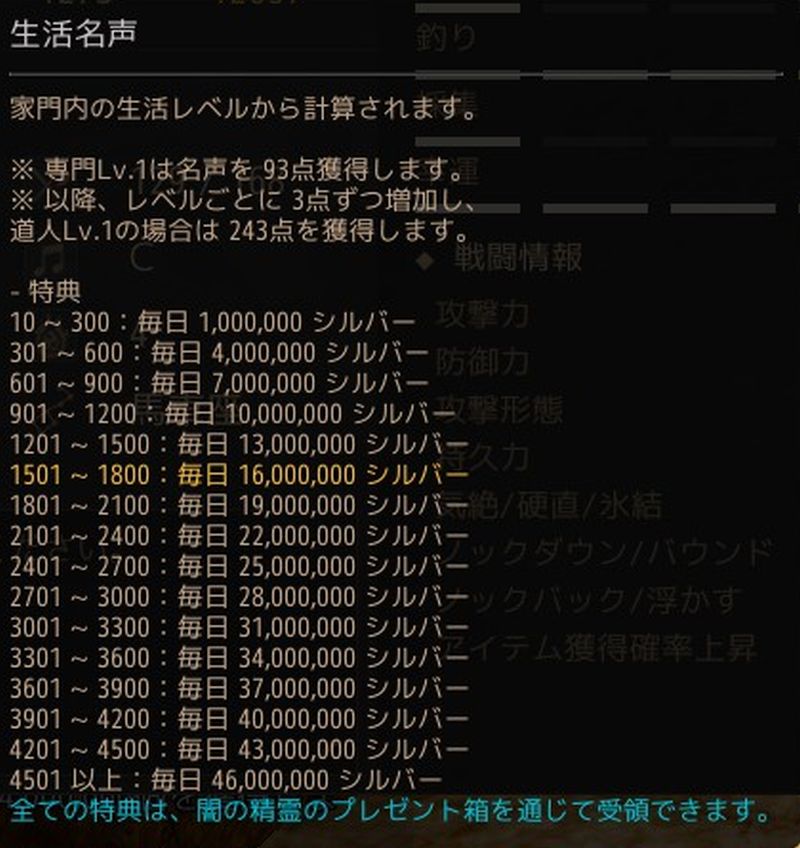 獲得シルバーに影響はないんですが、「戦闘名声」「生活名声」「特殊名声」の合計から換算される「特殊名声」もあります。
