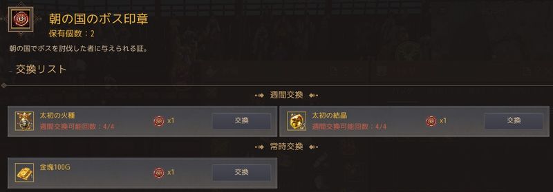朝の国のボス印章というのが2個出てて、財貨リストを見ると「太初の火種」と交換できるようなので、ちょっと安心。
