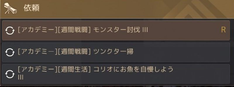 オルビア・アカデミーの週間依頼は、「掲示板」と「クリフ」から受けられる依頼が、全部で4つあります。