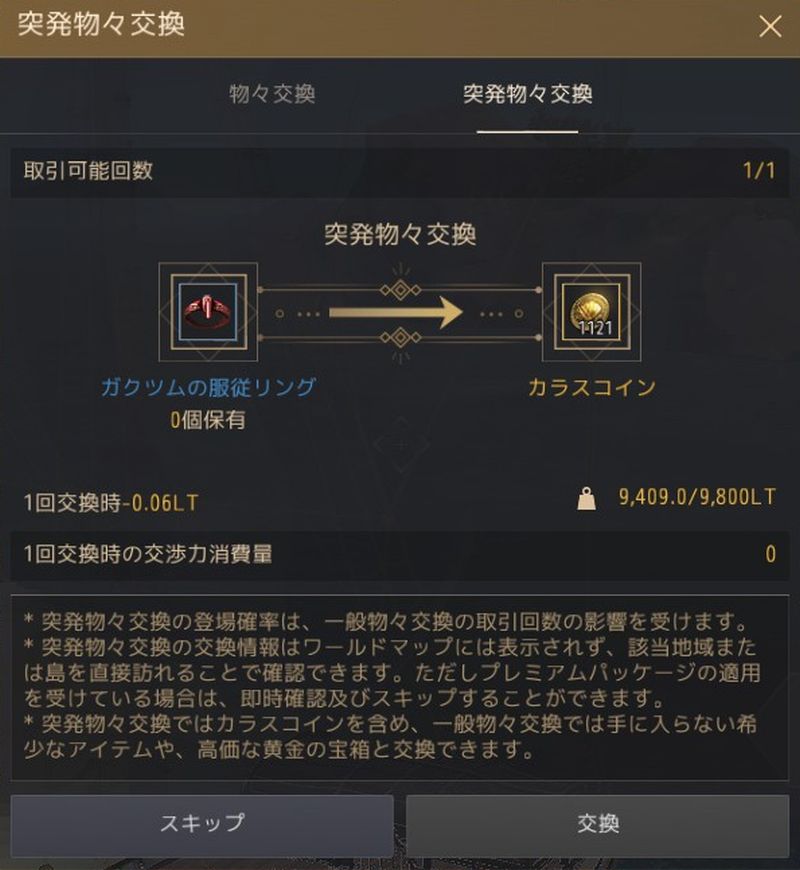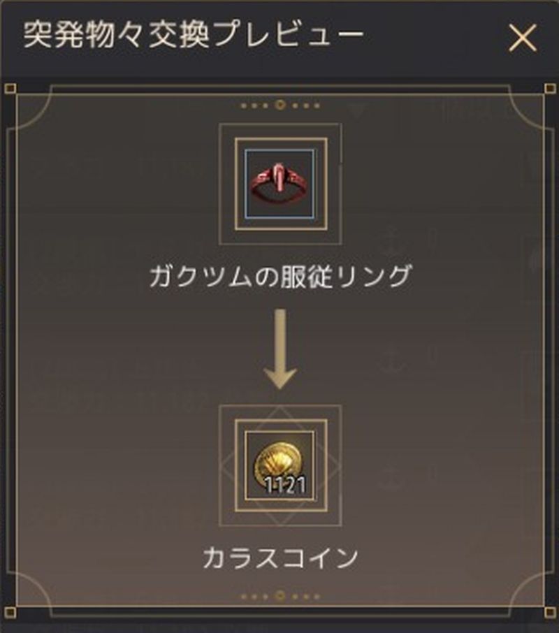 内容は「真Ⅰガクツムの服従リング」と「カラスコイン:1121」の交換。
