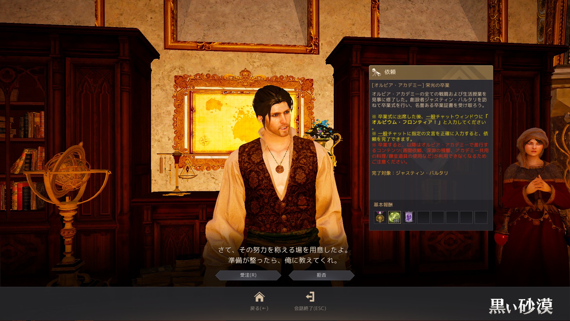 オルビア・アカデミーを卒業するには、総長のジャスティン・バルタリから「卒業依頼」を受注する必要があります。