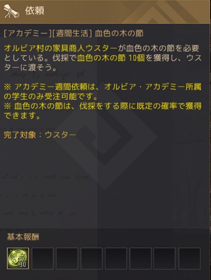 目標は、伐採で血色の木の節10個を集めて、ウスターに渡す。