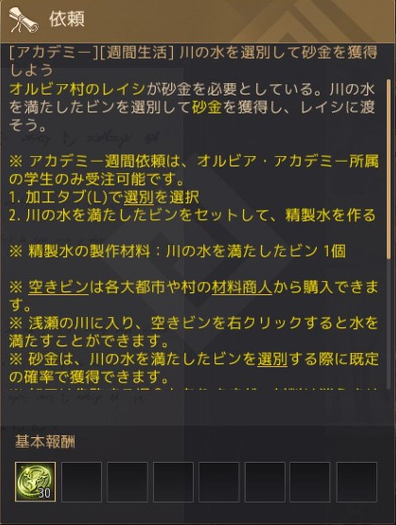 - 週間生活:川の水を選別して砂金を獲得しよう