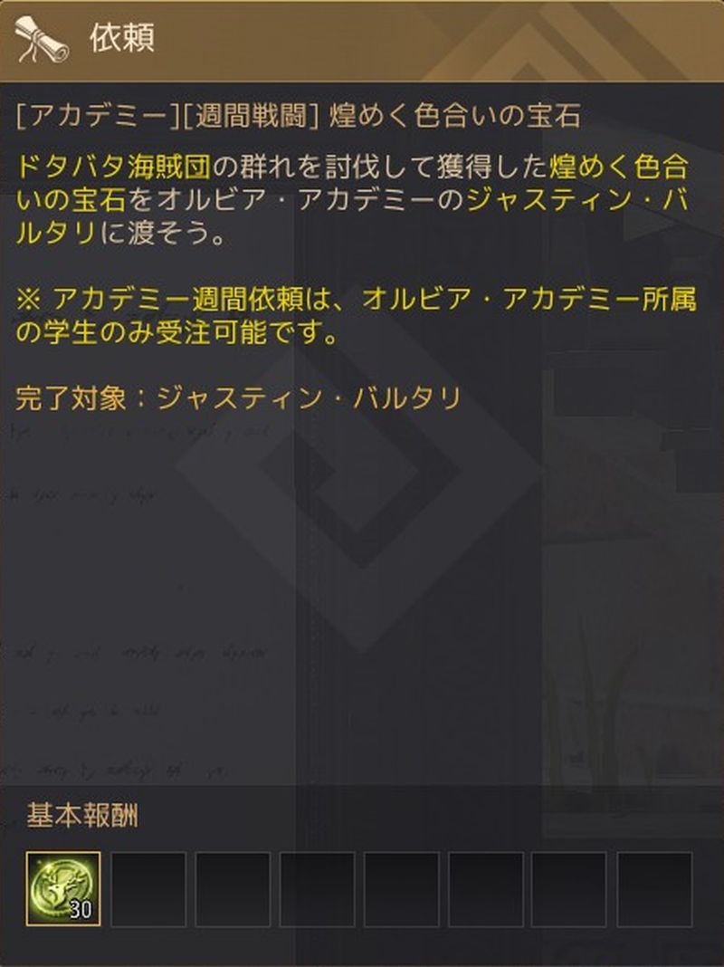 煌めく色合いの宝石を既に所持していれば、そのままジャスティン・バルタリに渡すだけなのでスグに依頼達成となります。
