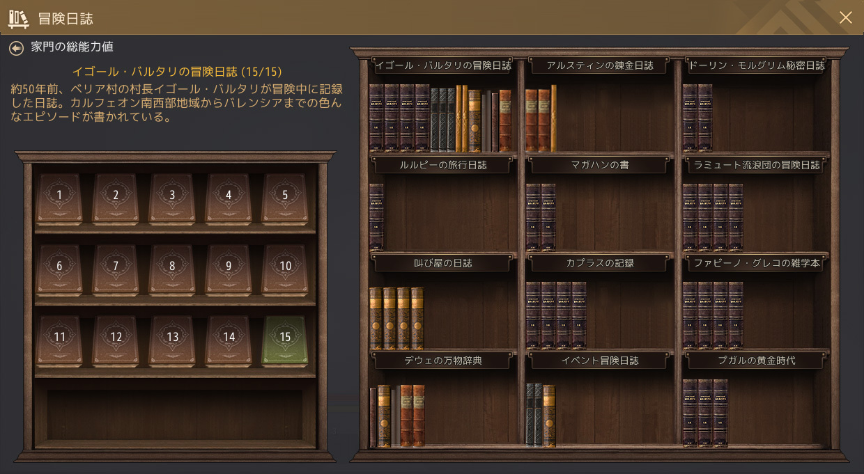 冒険日誌は様々なテーマで、数冊本の状態になっており「冒険者の本棚」という形で確認することができます。